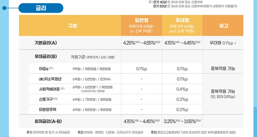 특례보금자리론 우대형은 최저 4.15%, 일반형은 최저 4.25% 금리를 적용합니다. 다만, 신청유형에 따라서 최대 0.8% 우대금리를 적용받을 수 있습니다. 우대금리 조건을 꼼꼼히 체크하시길 바랍니다.