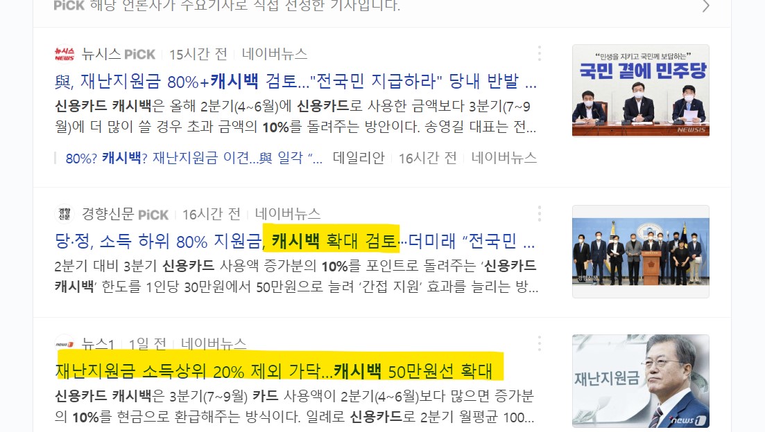 당정은 재난지원금에서 소외를 받는, 고소득층도 혜택을 받고 소비촉진 효과가 있는 신용카드 사용액 10% 캐시백 지원을 계획하고 있다. 2분기 (4월-6월) , 3분기(7월-9월) 사용한 금액을 비교하여 초과금액의 10% 돌려주는 방안이다. 다만 현재 최대한도 30만 원~50만 원, 제외 장소(대형마트 등), 품목(자동차 등)등을 논의하고 있다.