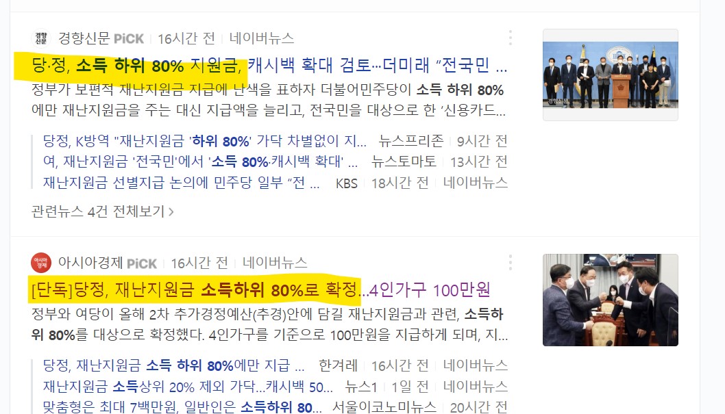 24일 더불어민주당은 5차 재난지원금의 대상을 소득 하위 80%로 확정했다. 1인당 25만 원 4인 가구 기준 100만 원 지급할 예정이다. 당초 더불어 민주당은 " 전 국민 지급 "을 주장했고, 기획재정부는 피해계층을 중심으로 " 소득 하위 70% " 고수했으나, 당정협의를 통해서 "고소득 제외" 방침에 합의하였다.